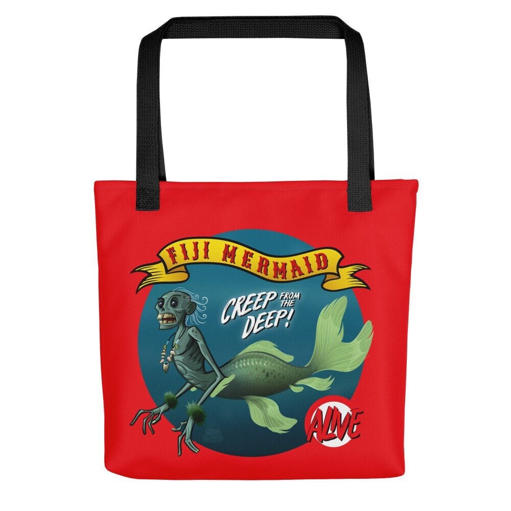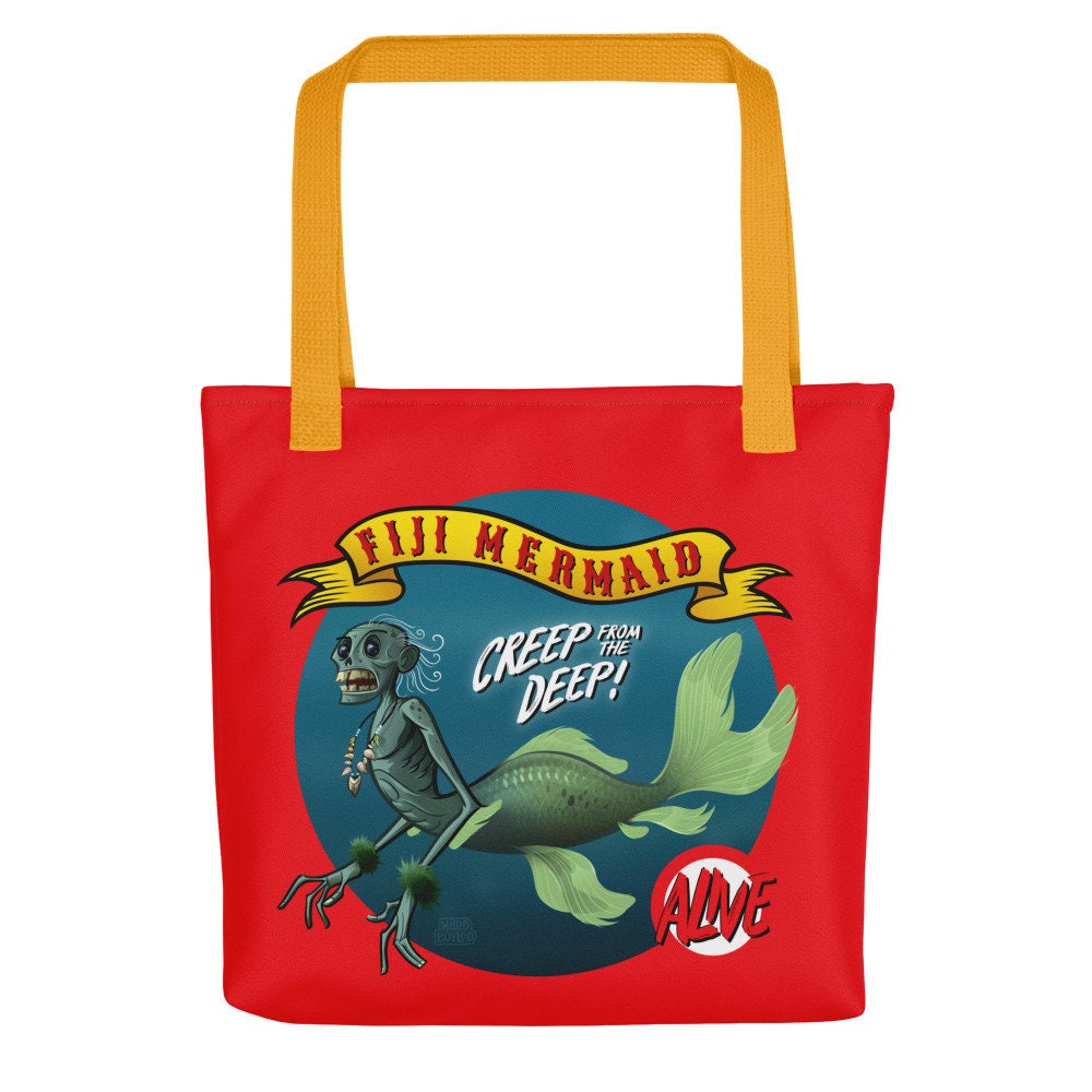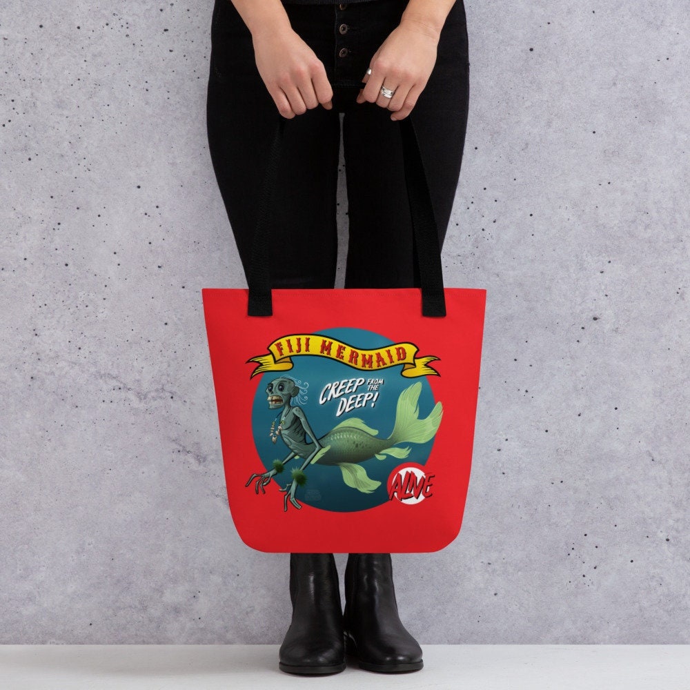 Bring the sideshow to the seaside with this spacious and trendy tote bag featuring the infamous sideshow oddity, the Fiji Mermaid.